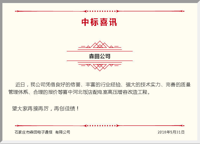 【中標喜訊】熱烈慶祝森田公司中標河北飯店配電室高壓增容改造工程